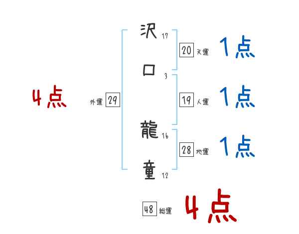 外運![]() | 沢口龍童さんの外運は29画の4つ星!完全主義で才能がある。厳格な心の持ち主。 生活面を象徴する運勢です。外部から受ける影響力を表し、結婚運、家庭運や職場、環境への順応性を表します。 |