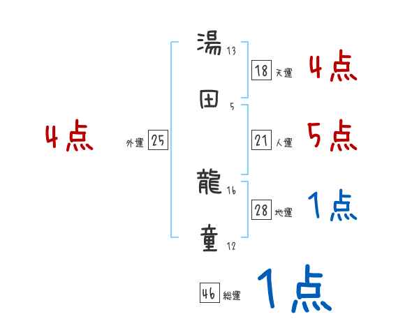 天運![]() | 湯田龍童さんの天運は18画の4つ星!情熱的で剛気。忍耐力があり信頼される。 家系が持つ宿命的な運勢を表します。祖先から受け継いだ苗字ですので自分の力が及びません。家柄を象徴します。 |