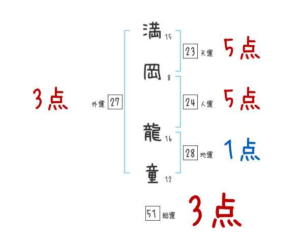 総運![]() | 満岡龍童さんの総運は51画の3つ星!変化が激しく、危険に注意。堅実な性格。 あなたの人生を表す1番重要な運勢です。生涯を通じて影響する総合運となり、主に50歳以降の晩年期に影響を及ぼします。 |