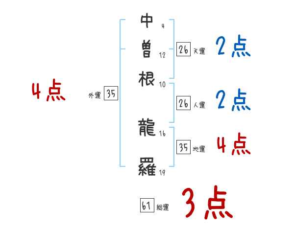 外運![]() | 中曽根龍羅さんの外運は35画の4つ星!温厚な性格で感受性が高い。穏和な性格で人望が厚い。 生活面を象徴する運勢です。外部から受ける影響力を表し、結婚運、家庭運や職場、環境への順応性を表します。 |