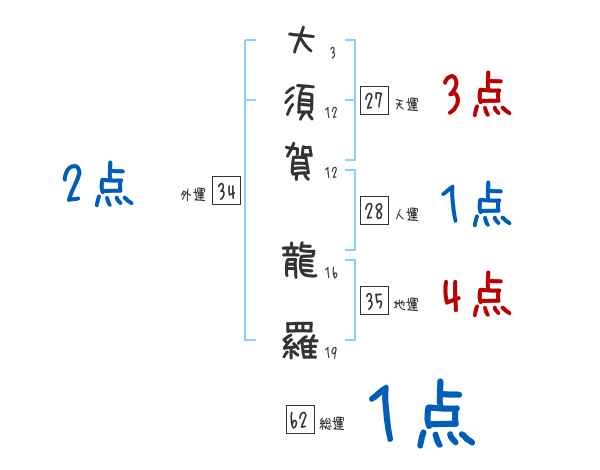 天運![]() | 大須賀龍羅さんの天運は27画の3つ星!頭脳明晰だが強情で摩擦が多い傾向。孤立に注意。 家系が持つ宿命的な運勢を表します。祖先から受け継いだ苗字ですので自分の力が及びません。家柄を象徴します。 |