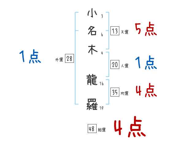 外運![]() | 小名木龍羅さんの外運は28画の1つ星!家庭環境に注意。スポーツで活躍できる能力があるかも。 生活面を象徴する運勢です。外部から受ける影響力を表し、結婚運、家庭運や職場、環境への順応性を表します。 |