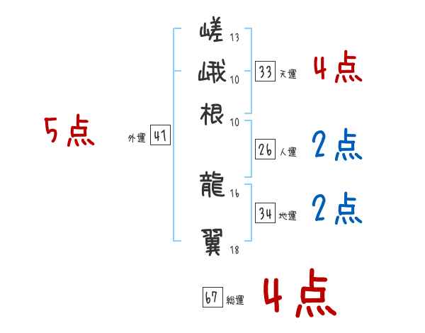 天運![]() | 嵯峨根龍翼さんの天運は33画の4つ星!権力志向でプライドが高い。勇気があり運を切り開き成功する。 家系が持つ宿命的な運勢を表します。祖先から受け継いだ苗字ですので自分の力が及びません。家柄を象徴します。 |