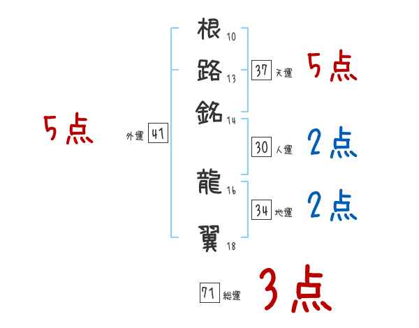 地運![]() | 根路銘龍翼さんの地運は34画の2つ星!独創性に優れるが、自尊心が強く災難に注意しましょう。 個性を表す基礎的な運勢です。性格形成や対人関係、行動力など家庭環境に影響されます。主に誕生してから20歳くらいまでの若年期の運勢を表します。 |