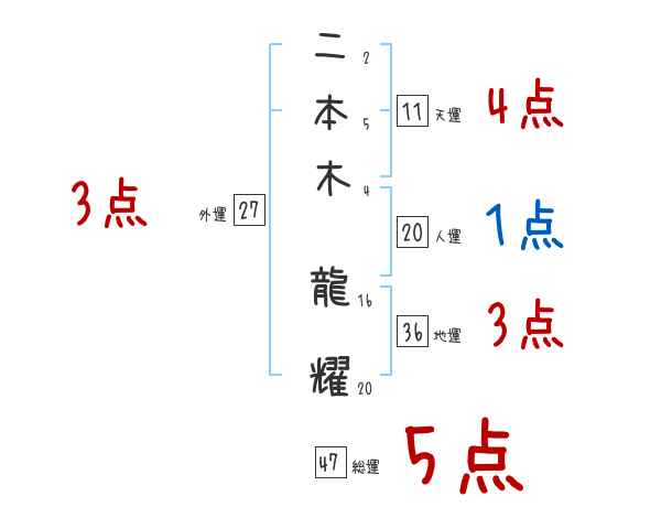 天運![]() | 二本木龍耀さんの天運は11画の4つ星!着実に富や地位を得る幸運な人生。 家系が持つ宿命的な運勢を表します。祖先から受け継いだ苗字ですので自分の力が及びません。家柄を象徴します。 |