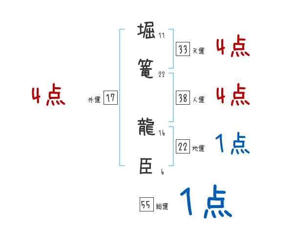 天運![]() | 堀篭龍臣さんの天運は33画の4つ星!権力志向でプライドが高い。勇気があり運を切り開き成功する。 家系が持つ宿命的な運勢を表します。祖先から受け継いだ苗字ですので自分の力が及びません。家柄を象徴します。 |