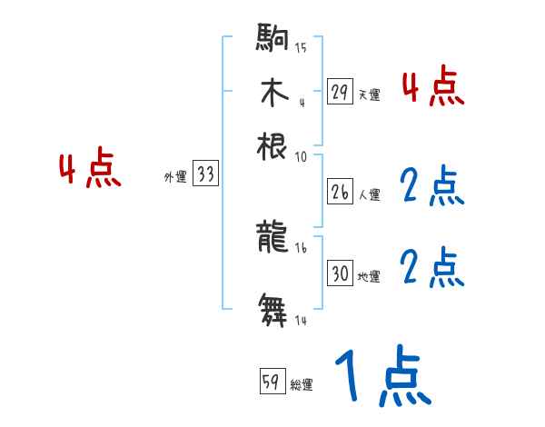 外運![]() | 駒木根龍舞さんの外運は33画の4つ星!権力志向でプライドが高い。勇気があり運を切り開き成功する。 生活面を象徴する運勢です。外部から受ける影響力を表し、結婚運、家庭運や職場、環境への順応性を表します。 |