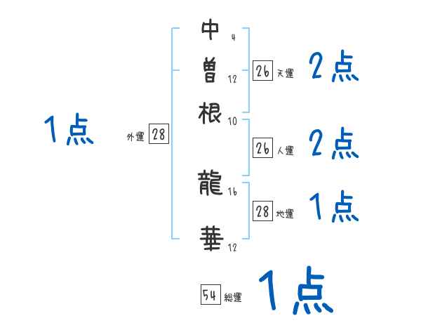 外運![]() | 中曽根龍華さんの外運は28画の1つ星!家庭環境に注意。スポーツで活躍できる能力があるかも。 生活面を象徴する運勢です。外部から受ける影響力を表し、結婚運、家庭運や職場、環境への順応性を表します。 |