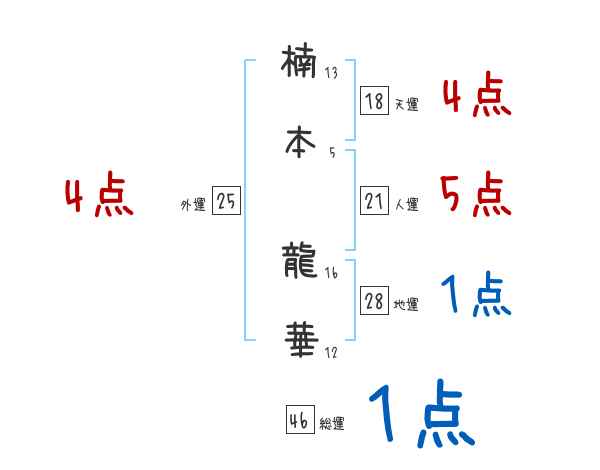 天運![]() | 楠本龍華さんの天運は18画の4つ星!情熱的で剛気。忍耐力があり信頼される。 家系が持つ宿命的な運勢を表します。祖先から受け継いだ苗字ですので自分の力が及びません。家柄を象徴します。 |