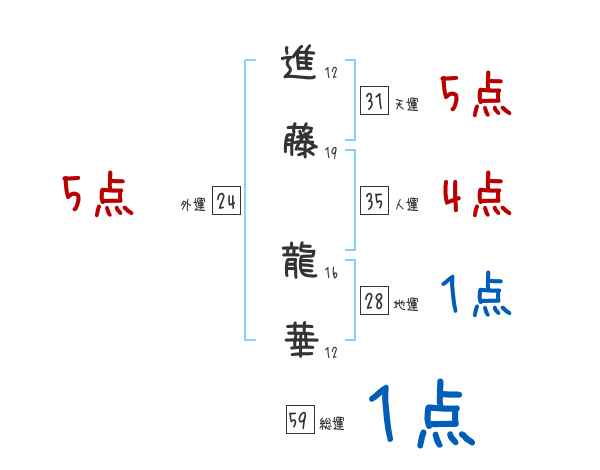 外運![]() | 進藤龍華さんの外運は24画の5つ星!家庭運が良く順調な人生。金運にも恵まれる。 生活面を象徴する運勢です。外部から受ける影響力を表し、結婚運、家庭運や職場、環境への順応性を表します。 |