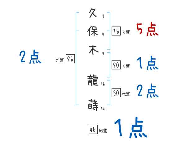 外運![]() | 久保木龍蒔さんの外運は26画の2つ星!波瀾万丈かも。信頼できる人を大事にしましょう。 生活面を象徴する運勢です。外部から受ける影響力を表し、結婚運、家庭運や職場、環境への順応性を表します。 |