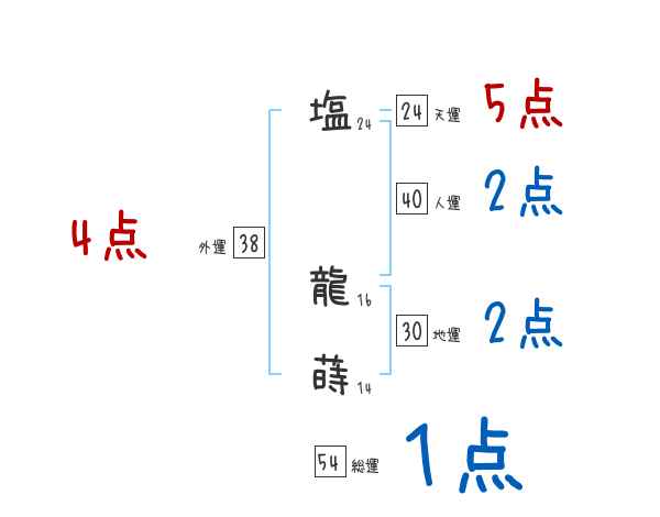 天運![]() | 塩龍蒔さんの天運は24画の5つ星!家庭運が良く順調な人生。金運にも恵まれる。 家系が持つ宿命的な運勢を表します。祖先から受け継いだ苗字ですので自分の力が及びません。家柄を象徴します。 |