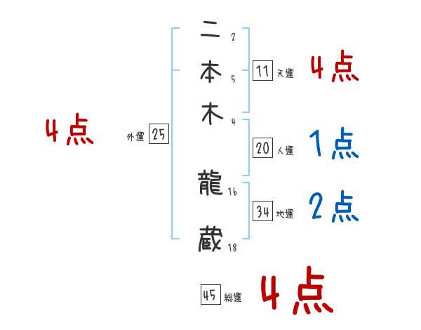 総運![]() | 二本木龍蔵さんの総運は45画の4つ星!もくもくと物事を進め達成する。地味な努力家。 あなたの人生を表す1番重要な運勢です。生涯を通じて影響する総合運となり、主に50歳以降の晩年期に影響を及ぼします。 |