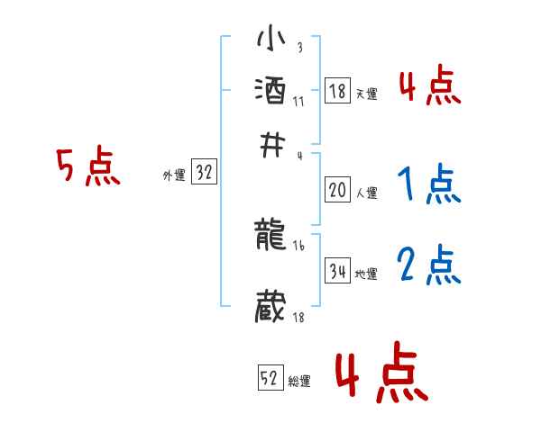 外運![]() | 小酒井龍蔵さんの外運は32画の5つ星!柔軟性があり成功する。チャンスが多く金運が良い。 生活面を象徴する運勢です。外部から受ける影響力を表し、結婚運、家庭運や職場、環境への順応性を表します。 |