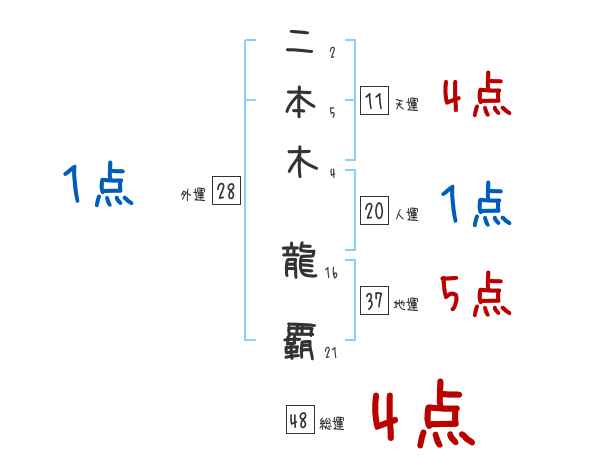 天運![]() | 二本木龍覇さんの天運は11画の4つ星!着実に富や地位を得る幸運な人生。 家系が持つ宿命的な運勢を表します。祖先から受け継いだ苗字ですので自分の力が及びません。家柄を象徴します。 |