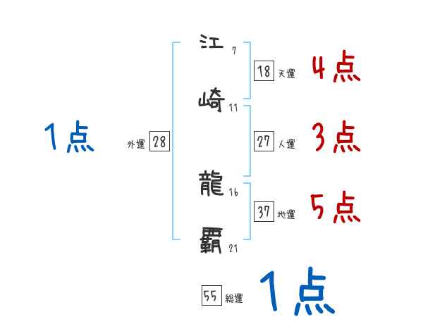 外運![]() | 江崎龍覇さんの外運は28画の1つ星!家庭環境に注意。スポーツで活躍できる能力があるかも。 生活面を象徴する運勢です。外部から受ける影響力を表し、結婚運、家庭運や職場、環境への順応性を表します。 |