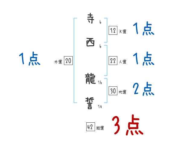 天運![]() | 寺西龍誓さんの天運は12画の1つ星!簡単な失敗で諦めてしまいやすいかも。着実に行動すると良いでしょう。 家系が持つ宿命的な運勢を表します。祖先から受け継いだ苗字ですので自分の力が及びません。家柄を象徴します。 |