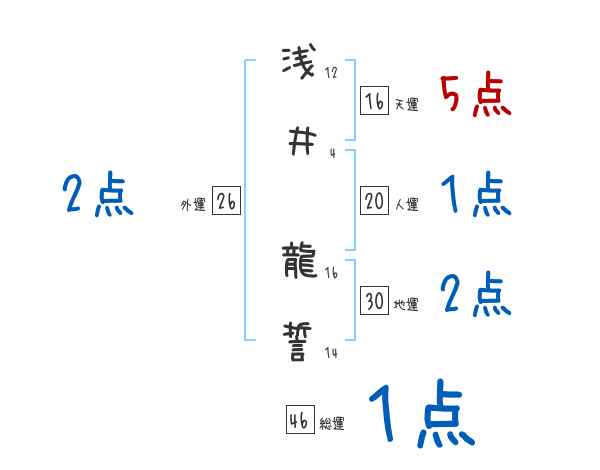総運![]() | 浅井龍誓さんの総運は46画の1つ星!迷走することが多く苦労するかも。目先のことにとらわれないように。 あなたの人生を表す1番重要な運勢です。生涯を通じて影響する総合運となり、主に50歳以降の晩年期に影響を及ぼします。 |