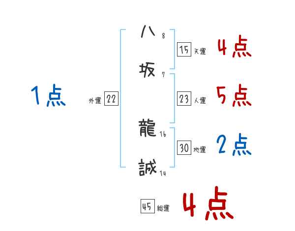人運![]() | 八坂龍誠さんの人運は23画の5つ星!想像力に優れ活力がある。一代で成功し名誉を手に入れる。 性格や才能などを表す2番目に重要な運勢です。人間関係や協調性、社会的な成功に影響します。主に20歳から50歳ぐらいまでの中年期の運勢を表します。 |