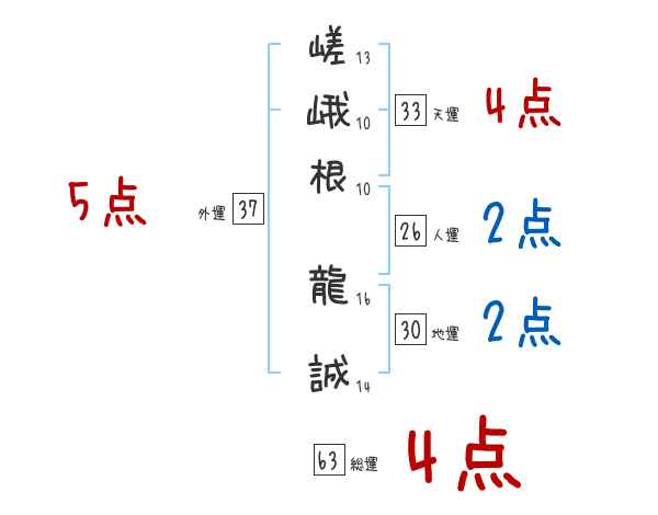 外運![]() | 嵯峨根龍誠さんの外運は37画の5つ星!努力家で順応性に優れる。現実的な考え方ができ忠実に物事をこなす。 生活面を象徴する運勢です。外部から受ける影響力を表し、結婚運、家庭運や職場、環境への順応性を表します。 |