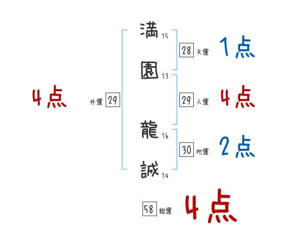 総運![]() | 満園龍誠さんの総運は58画の4つ星!安定した生活。大器晩成タイプ。 あなたの人生を表す1番重要な運勢です。生涯を通じて影響する総合運となり、主に50歳以降の晩年期に影響を及ぼします。 |
