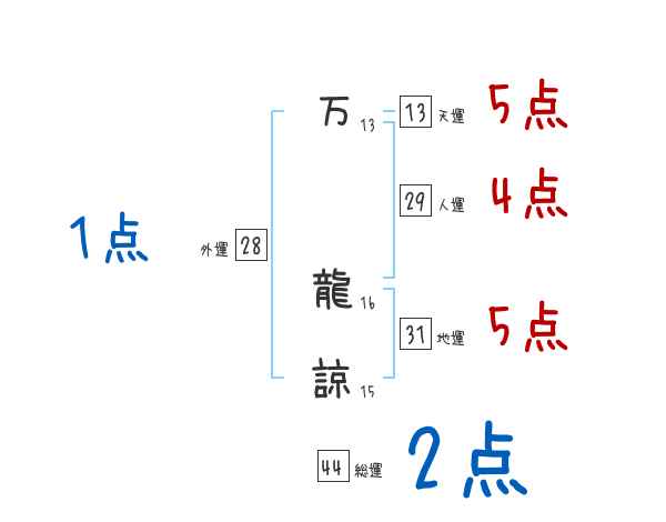 天運![]() | 万龍諒さんの天運は13画の5つ星!才能に恵まれ人気がある。名声を手に入れる。円満な人生。 家系が持つ宿命的な運勢を表します。祖先から受け継いだ苗字ですので自分の力が及びません。家柄を象徴します。 |