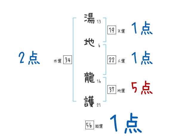 天運![]() | 湯地龍護さんの天運は19画の1つ星!優れた才能を持ちますが、協調性が足りないことも。周りの人と協力する事を意識しましょう。 家系が持つ宿命的な運勢を表します。祖先から受け継いだ苗字ですので自分の力が及びません。家柄を象徴します。 |