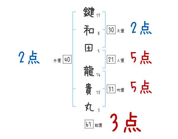 人運![]() | 鍵和田龍貴丸さんの人運は21画の5つ星!統率力がある。独立し成功する。名誉を手に入れる。 性格や才能などを表す2番目に重要な運勢です。人間関係や協調性、社会的な成功に影響します。主に20歳から50歳ぐらいまでの中年期の運勢を表します。 |