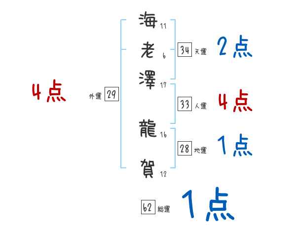 外運![]() | 海老澤龍賀さんの外運は29画の4つ星!完全主義で才能がある。厳格な心の持ち主。 生活面を象徴する運勢です。外部から受ける影響力を表し、結婚運、家庭運や職場、環境への順応性を表します。 |