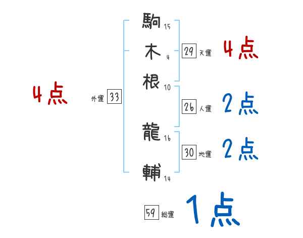 天運![]() | 駒木根龍輔さんの天運は29画の4つ星!完全主義で才能がある。厳格な心の持ち主。 家系が持つ宿命的な運勢を表します。祖先から受け継いだ苗字ですので自分の力が及びません。家柄を象徴します。 |