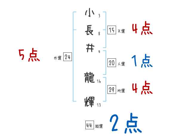 総運![]() | 小長井龍輝さんの総運は44画の2つ星!誠実で慎重な性格。物事を考えすぎないように注意しましょう。 あなたの人生を表す1番重要な運勢です。生涯を通じて影響する総合運となり、主に50歳以降の晩年期に影響を及ぼします。 |