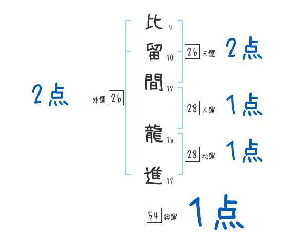天運![]() | 比留間龍進さんの天運は26画の2つ星!波瀾万丈かも。信頼できる人を大事にしましょう。 家系が持つ宿命的な運勢を表します。祖先から受け継いだ苗字ですので自分の力が及びません。家柄を象徴します。 |