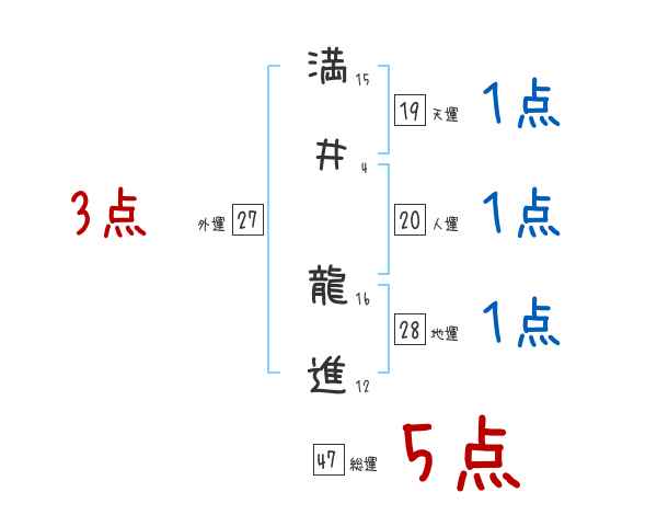 総運![]() | 満井龍進さんの総運は47画の5つ星!実力が開花し発展する円満な人生。財に恵まれる。 あなたの人生を表す1番重要な運勢です。生涯を通じて影響する総合運となり、主に50歳以降の晩年期に影響を及ぼします。 |