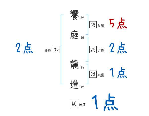 天運![]() | 饗庭龍進さんの天運は32画の5つ星!柔軟性があり成功する。チャンスが多く金運が良い。 家系が持つ宿命的な運勢を表します。祖先から受け継いだ苗字ですので自分の力が及びません。家柄を象徴します。 |