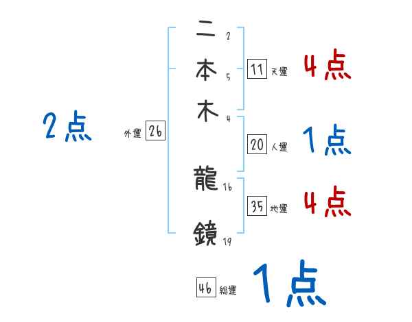 天運![]() | 二本木龍鏡さんの天運は11画の4つ星!着実に富や地位を得る幸運な人生。 家系が持つ宿命的な運勢を表します。祖先から受け継いだ苗字ですので自分の力が及びません。家柄を象徴します。 |