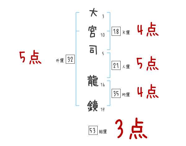 外運![]() | 大宮司龍鏡さんの外運は32画の5つ星!柔軟性があり成功する。チャンスが多く金運が良い。 生活面を象徴する運勢です。外部から受ける影響力を表し、結婚運、家庭運や職場、環境への順応性を表します。 |