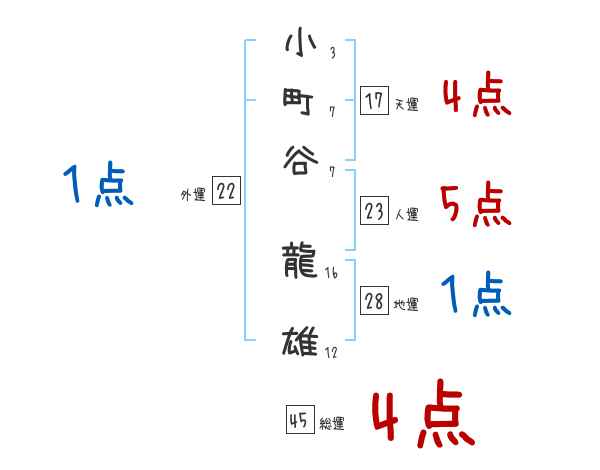 天運![]() | 小町谷龍雄さんの天運は17画の4つ星!積極的な行動力。地位を気づき財産を手に入れる。純粋な心と直感力。 家系が持つ宿命的な運勢を表します。祖先から受け継いだ苗字ですので自分の力が及びません。家柄を象徴します。 |