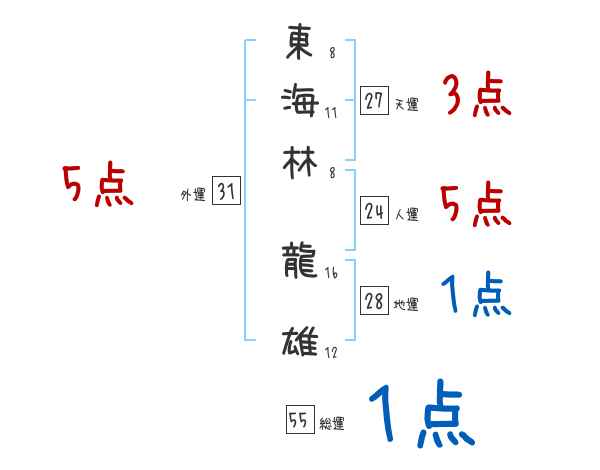 人運![]() | 東海林龍雄さんの人運は24画の5つ星!家庭運が良く順調な人生。金運にも恵まれる。 性格や才能などを表す2番目に重要な運勢です。人間関係や協調性、社会的な成功に影響します。主に20歳から50歳ぐらいまでの中年期の運勢を表します。 |