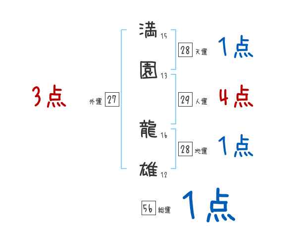 人運![]() | 満園龍雄さんの人運は29画の4つ星!完全主義で才能がある。厳格な心の持ち主。 性格や才能などを表す2番目に重要な運勢です。人間関係や協調性、社会的な成功に影響します。主に20歳から50歳ぐらいまでの中年期の運勢を表します。 |