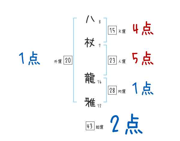 天運![]() | 八杖龍雅さんの天運は15画の4つ星!人徳があり出世する。順調に物事を進め円満な人生。 家系が持つ宿命的な運勢を表します。祖先から受け継いだ苗字ですので自分の力が及びません。家柄を象徴します。 |