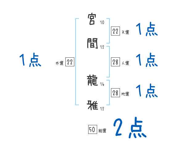 外運![]() | 宮間龍雅さんの外運は22画の1つ星!努力することが苦手ないっぽう手先が器用。芸術性にも優れる。 生活面を象徴する運勢です。外部から受ける影響力を表し、結婚運、家庭運や職場、環境への順応性を表します。 |