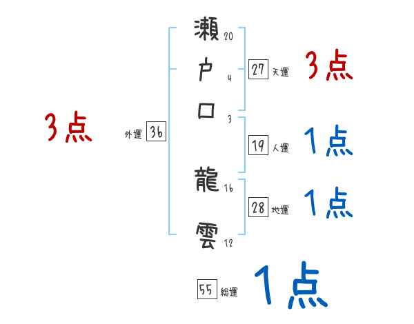 天運![]() | 瀬戸口龍雲さんの天運は27画の3つ星!頭脳明晰だが強情で摩擦が多い傾向。孤立に注意。 家系が持つ宿命的な運勢を表します。祖先から受け継いだ苗字ですので自分の力が及びません。家柄を象徴します。 |