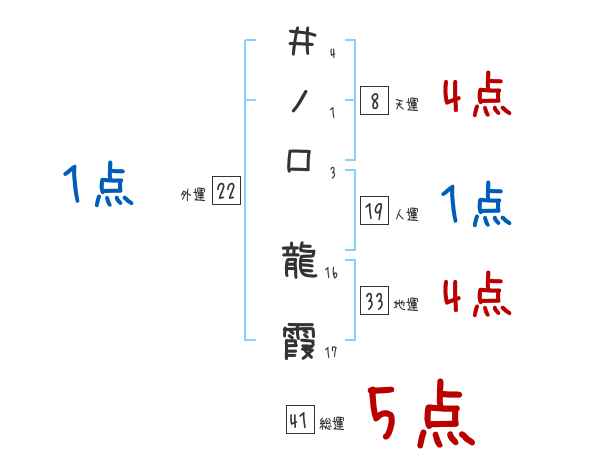 外運![]() | 井ノ口龍霞さんの外運は22画の1つ星!努力することが苦手ないっぽう手先が器用。芸術性にも優れる。 生活面を象徴する運勢です。外部から受ける影響力を表し、結婚運、家庭運や職場、環境への順応性を表します。 |