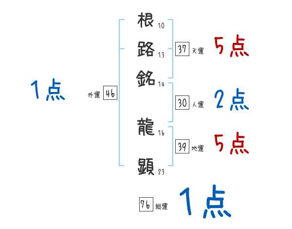 総運![]() | 根路銘龍顕さんの総運は76画の1つ星!離散に注意。劣等感を感じ孤立しやすい傾向があるかも。 あなたの人生を表す1番重要な運勢です。生涯を通じて影響する総合運となり、主に50歳以降の晩年期に影響を及ぼします。 |