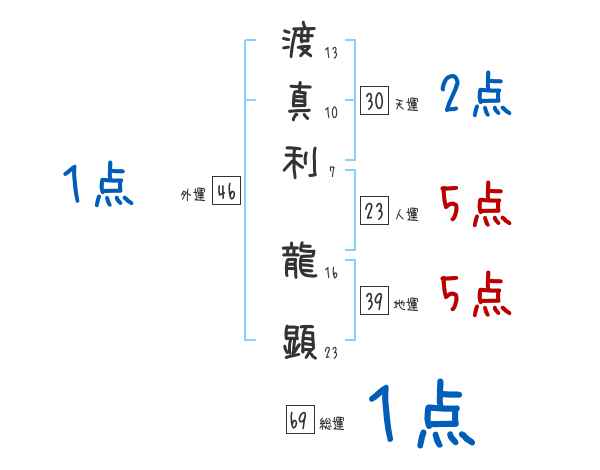天運![]() | 渡真利龍顕さんの天運は30画の2つ星!浮き沈みの激しさに注意しましょう。 家系が持つ宿命的な運勢を表します。祖先から受け継いだ苗字ですので自分の力が及びません。家柄を象徴します。 |