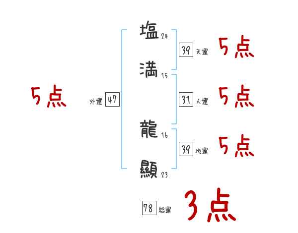 外運![]() | 塩満龍顯さんの外運は47画の5つ星!実力が開花し発展する円満な人生。財に恵まれる。 生活面を象徴する運勢です。外部から受ける影響力を表し、結婚運、家庭運や職場、環境への順応性を表します。 |
