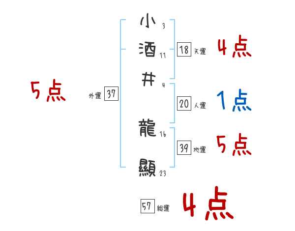 外運![]() | 小酒井龍顯さんの外運は37画の5つ星!努力家で順応性に優れる。現実的な考え方ができ忠実に物事をこなす。 生活面を象徴する運勢です。外部から受ける影響力を表し、結婚運、家庭運や職場、環境への順応性を表します。 |