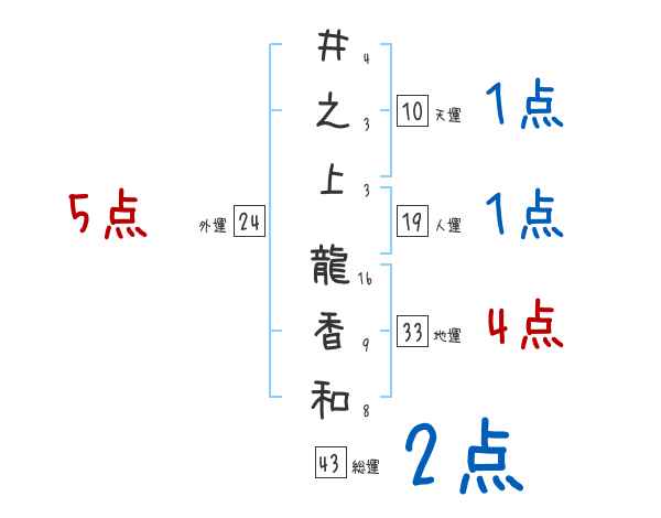 外運![]() | 井之上龍香和さんの外運は24画の5つ星!家庭運が良く順調な人生。金運にも恵まれる。 生活面を象徴する運勢です。外部から受ける影響力を表し、結婚運、家庭運や職場、環境への順応性を表します。 |