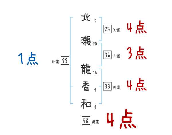 天運![]() | 北瀬龍香和さんの天運は25画の4つ星!個性があり才能があふれる。強運の持ち主で発展する。 家系が持つ宿命的な運勢を表します。祖先から受け継いだ苗字ですので自分の力が及びません。家柄を象徴します。 |