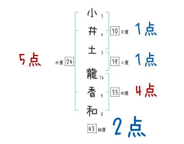 外運![]() | 小井土龍香和さんの外運は24画の5つ星!家庭運が良く順調な人生。金運にも恵まれる。 生活面を象徴する運勢です。外部から受ける影響力を表し、結婚運、家庭運や職場、環境への順応性を表します。 |